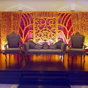 Elegant Mayo Floral Setup with Marigold Drapes and Traditional Pillows