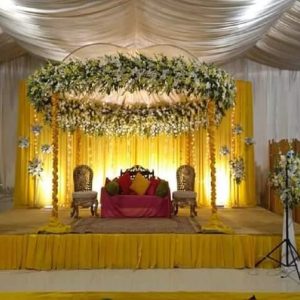 Elegant Floral Mandap with Traditional Yellow and White Wedding Backdrop