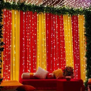 Elegant Wedding Backdrop with Red & Yellow Drapes and String Lights