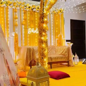 Elegant Yellow Mayo Setup with String Lights and Flower Decorations