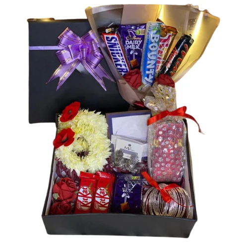 Chocolate Bouquet (5–6 pieces) including popular favorites like Dairy Milk, Bounty, Snickers, and more.