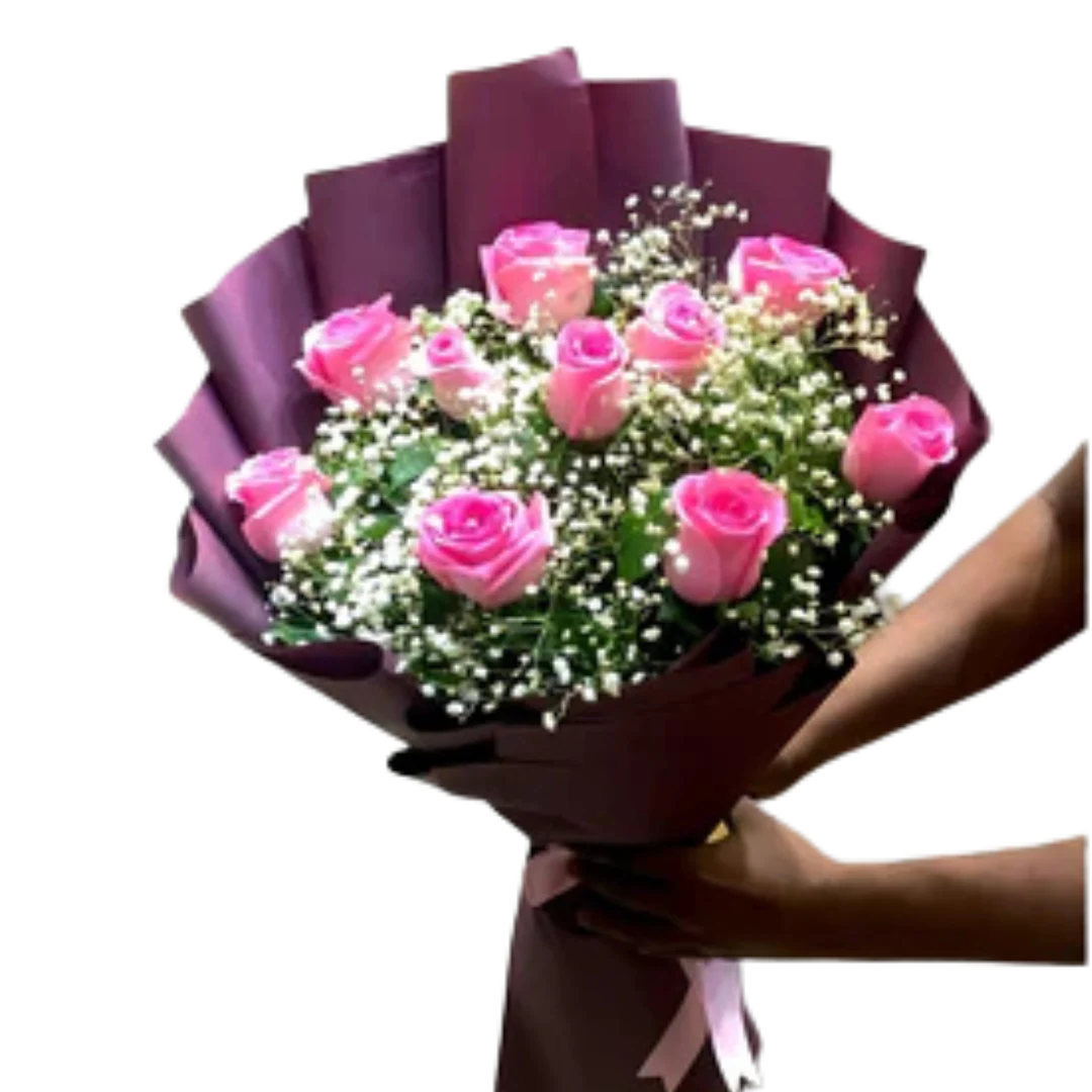 The bouquet is expertly crafted, with the roses carefully arranged in a harmonious and visually appealing manner. The lush foliage and delicate baby’s breath add a touch of natural elegance, complementing the overall aesthetic.