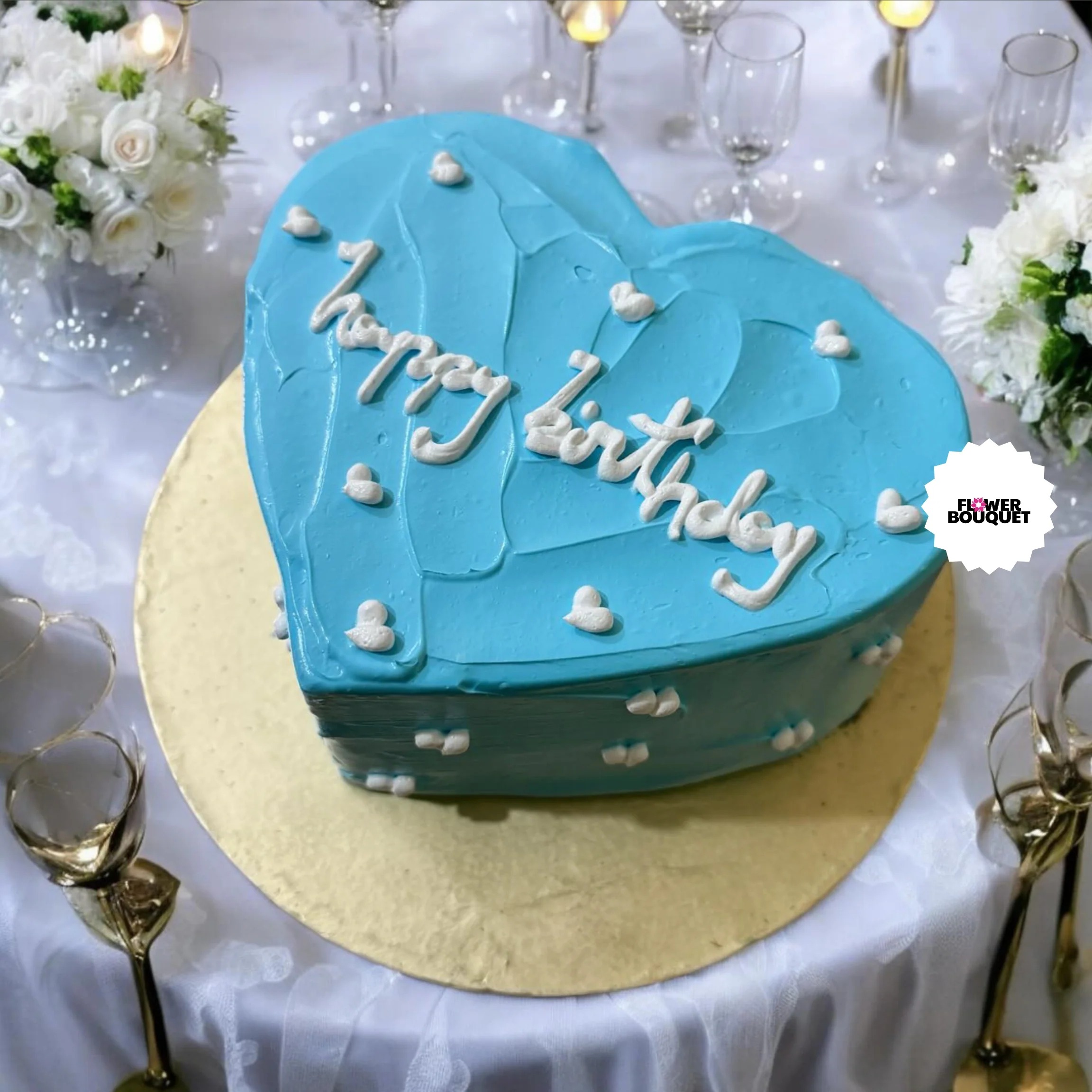 This charming cake is shaped like a big blue heart, perfect for a special birthday celebration. It’s covered in smooth, sky-blue frosting that looks soft and inviting. White frosting spells out “happy birthday” on top, surrounded by little white hearts sprinkled all over. The cake sits on a shiny gold board, making it look extra fancy. Around the cake, you can see parts of a beautifully set table with wine glasses and pretty white flowers, creating a lovely party atmosphere. This cake would make anyone feel loved and special on their birthday!