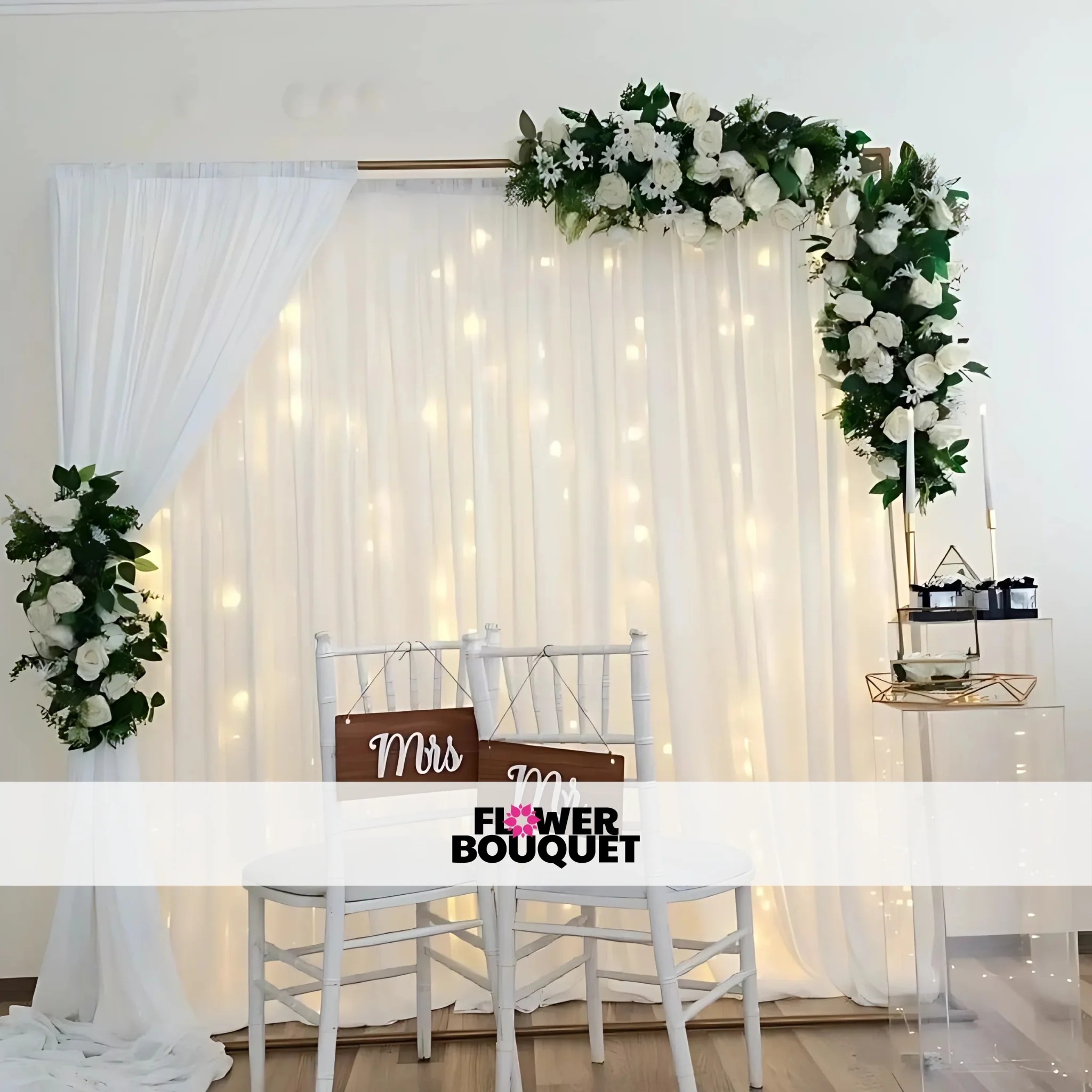 A minimalist white Nikah stage featuring a simple yet elegant floral arch and warm lighting. The green accents add a natural touch, while the wooden ‘Mr’ and ‘Mrs’ signs give a charming, personal feel. Perfect for a modern and stylish Nikah event.