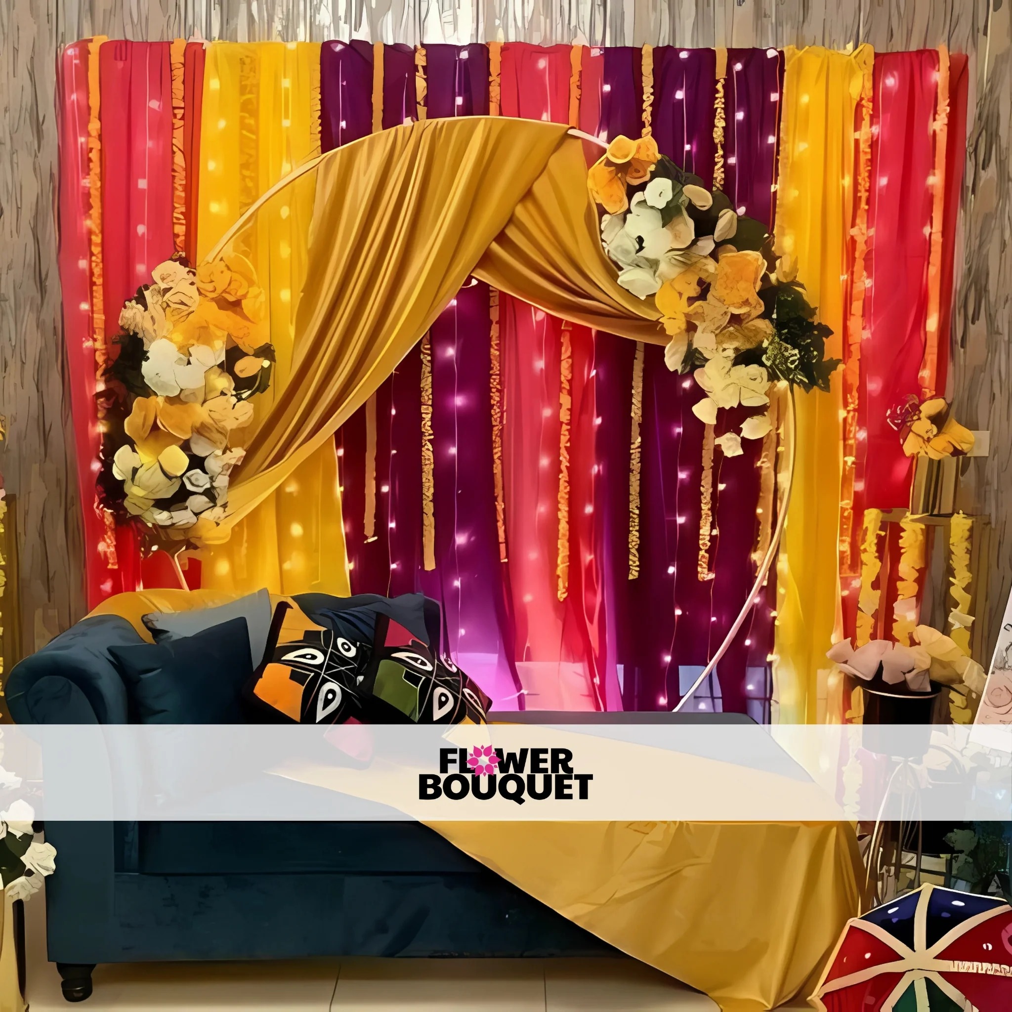 This modern Mehndi setup features a sleek circular floral frame with yellow and white flowers, vibrant drapes in yellow, pink, and purple, and subtle fairy lights for added charm. A blue sofa with colorful cushions completes the elegant yet festive decor. Ideal for contemporary Mehndi events