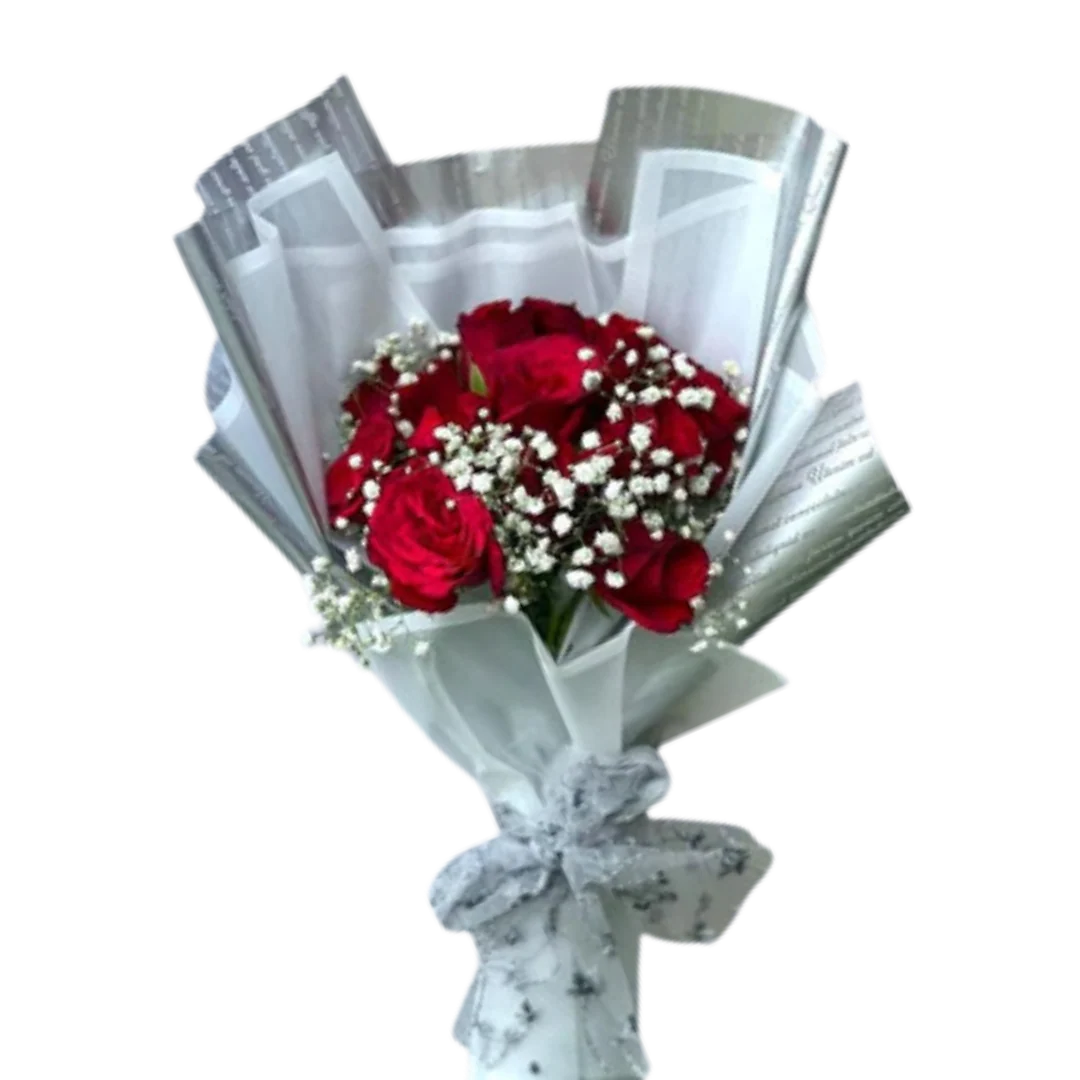 The “Eternal Romance” bouquet is a stunning arrangement including 7 Imported rose and 2 Gypso with Imported wrapping that captures the essence of love and beauty. At its heart lies the exquisite rose, symbolizing passion and devotion, which has been meticulously chosen for its vibrant hues and velvety petals. This bouquet features a harmonious blend of garden roses that exude elegance, accompanied by delicate blossoms that add texture and depth. Crafted with an artistic flair, the flowers are expertly arranged to create a breathtaking visual impact, evoking feelings of joy and nostalgia. Each stem is thoughtfully selected to ensure freshness and longevity, making this bouquet perfect for memorable occasions such as weddings or Valentine’s Day celebrations. The lush greenery interspersed throughout enhances the romantic allure while accentuating the bright colors of the blooms. Whether gifted or used as a decorative piece in your home, this splendid arrangement serves not just as a feast for the eyes but also as an enduring symbol of love that transcends time. Embrace this enchanting display that beautifully embodies nature’s artistry—making every moment unforgettable.