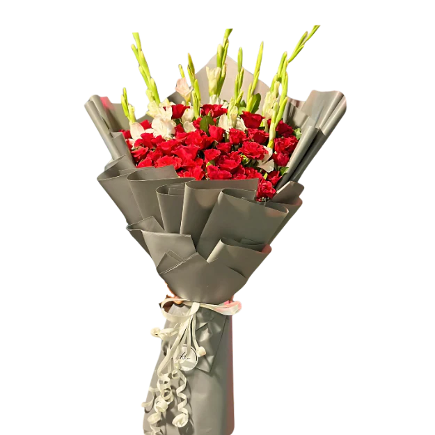 This Elegant Red Carnation & Gladiolus Bouquet combines the deep beauty of red carnations with the elegant stature of gladiolus. Perfect for celebrating love, admiration, and special moments, this bouquet is beautifully wrapped in gray paper and finished with a white satin ribbon.