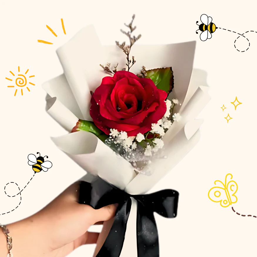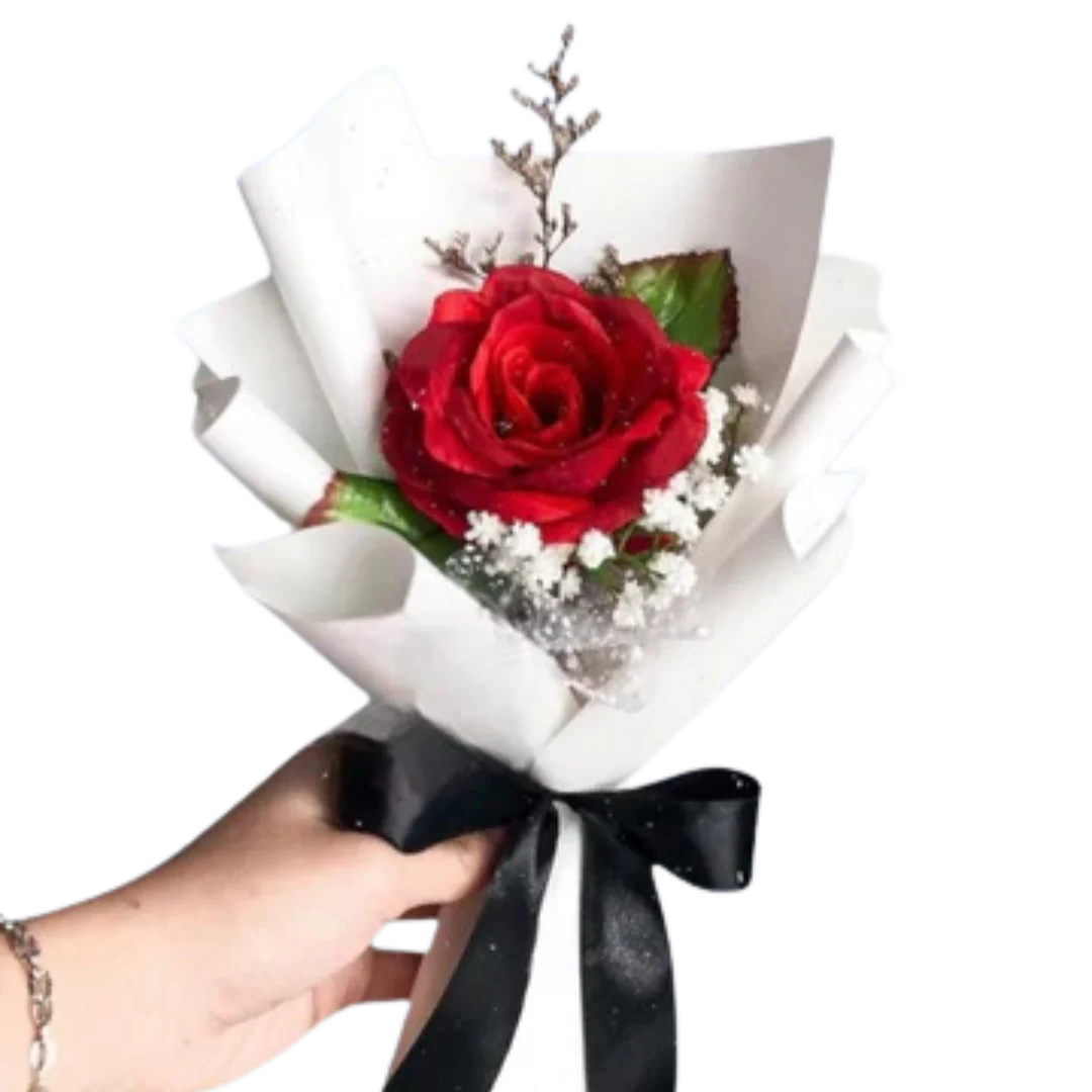 Blushing Rose: Highlights the soft pink wrapping and the red rose. Miniature Romance: Emphasizes the small size and romantic feel. Whispering Rose: Evokes a sense of gentle intimacy. Sweetheart Rose: A charming and affectionate name. Description: This charming “Single Rose Delight” bouquet is a perfect expression of heartfelt sentiment. A single, vibrant red rose, the epitome of classic romance, is nestled amongst delicate baby’s breath flowers. The soft pink wrapping adds a touch of understated elegance, making this a truly beautiful and memorable gift for a loved one. Its compact size makes it ideal for a small gesture of affection or a sweet surprise. The combination of the rich red rose and the airy baby’s breath creates a visually stunning and fragrant arrangement that is sure to be cherished