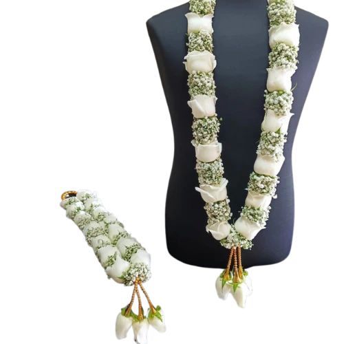 Expertly woven with alternating white roses and baby’s breath, styled in a graceful long mala design for a premium and traditional look.